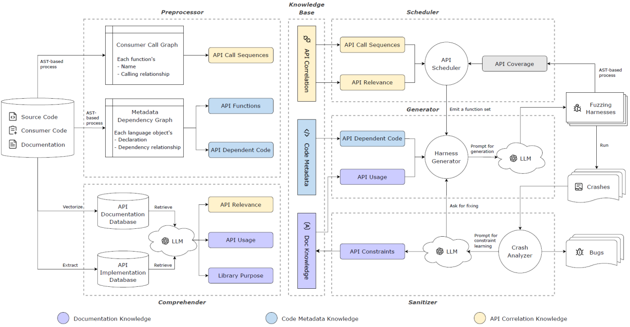 针对函数库的安全测试,编写模糊测试驱动是当前广泛采用的有效方案之一,其中如何实现高质量自动化的驱动生成是当前亟需解决的问题。已有研究尝试引入人工智能技术提高驱动生成能力(如Google OSS-Fuzz-Gen、PromptFuzz、CKGFuzzer等),但仍存在语义理解不足、误报率偏高、语言支持有限等问题,难以满足实际应用中的代码覆盖率和语义准确性需求。