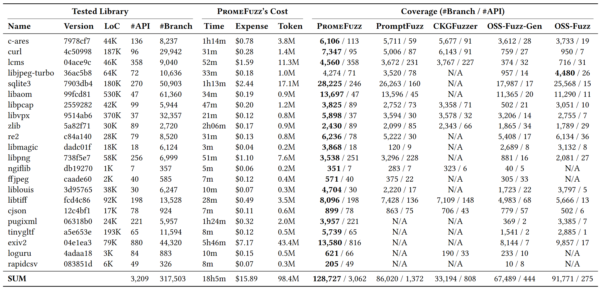 PromeFuzz可广泛运用于C和C++函数库的模糊测试,现在已在开源库发现25个未知漏洞。进一步的对比实验显示,相较Google OSS-Fuzz-Gen、PromptFuzz、CKGFuzzer等,PromeFuzz的代码覆盖率提升达40%至288%,误报率降低约89%。相关成果已经应用于OpenHarmony系统测试的实际场景,覆盖270余万行核心函数库代码。